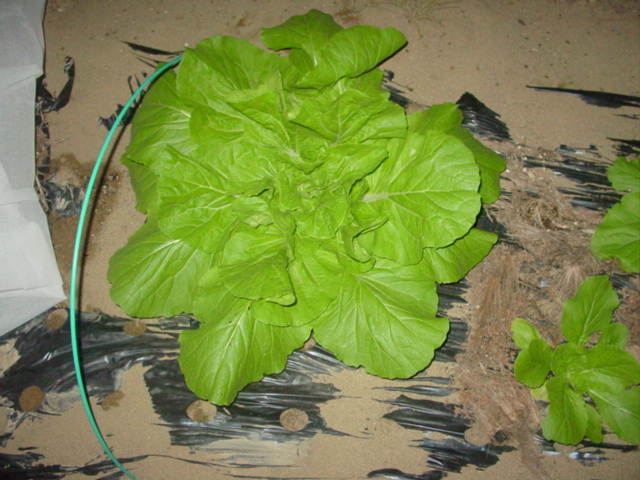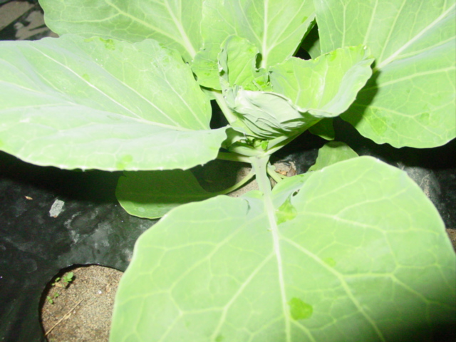 食事現場を押さえたのは初めてなのですが、せっかく育てた野菜を悠然と食べているその姿を見ると急に憎らしくなってきますね。捕殺してやりました。この後、不織布の中のキャベツにも1匹発見し、捕殺しました。どこから入ったんでしょうね?とにかく、気温の下がった今でも、無農薬露天栽培は無謀と悟り、不織布を買いに走りました。ちょうど値下げ中ということもあり、奮発して50m長を購入。有用資材は常備しとくに限ります。