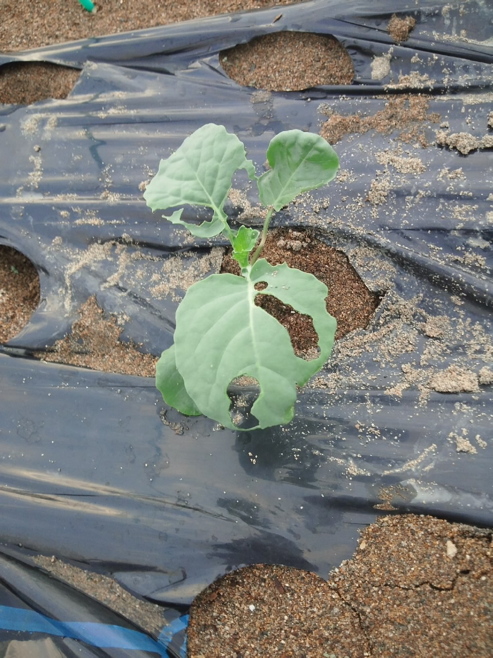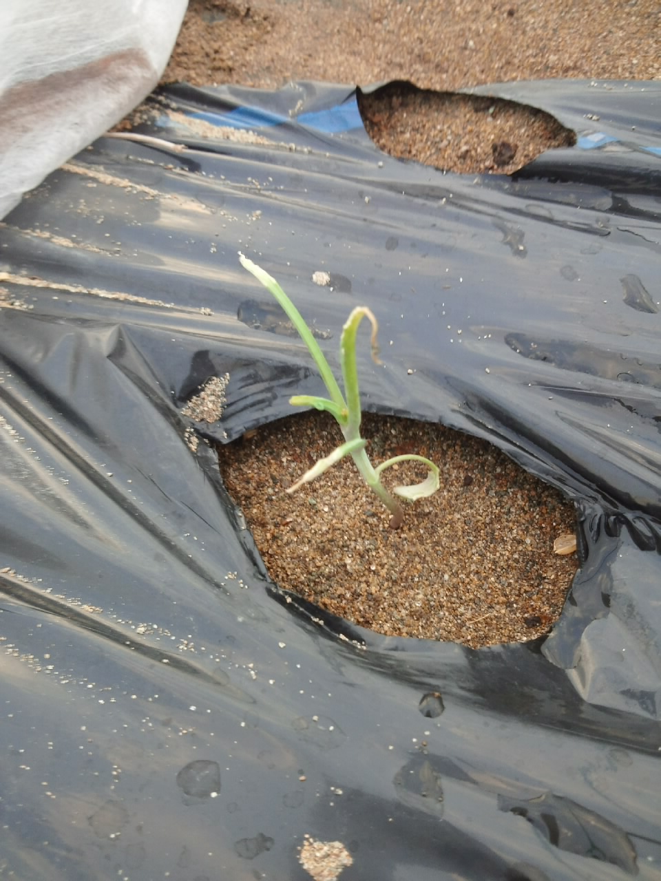 続いて圃場全体に水やりしました。砂が湿ったところで定植後2週間のブロッコリーに土寄せです。苗の時から曲がってしまってますが、葉が大きくなってきましたのでいよいよ曲がりがきつくなってきました。双葉の付け根あたりまでを軽く起こしてやって周りのマルチ穴から手を入れてグイグイと砂を寄せてやります。周囲を高くしてやらないことには、植えているマルチ穴だけ砂を盛ったところで、すぐに崩れてしまいそうです。まさに土寄せ。双葉から上も曲がっている部分はあり、下を起こすと横を向いてしまうのですが、日の光を受けて、自然と上を向いてくれるのではないでしょうか。土寄せしながら、活着していなさそうな2株を間引き、病的に白く変色した葉を摘み取ってやりました。