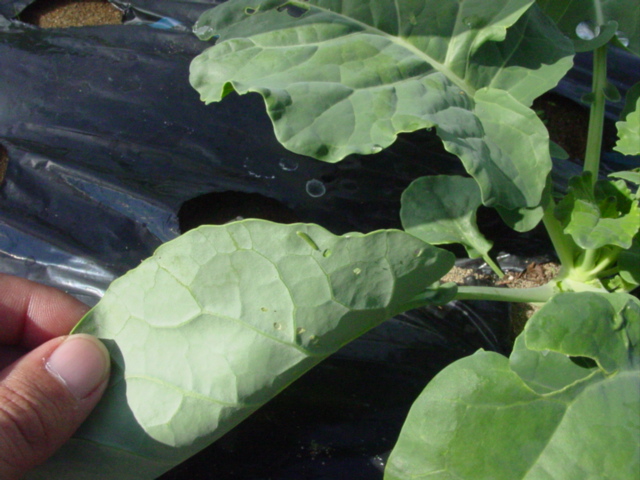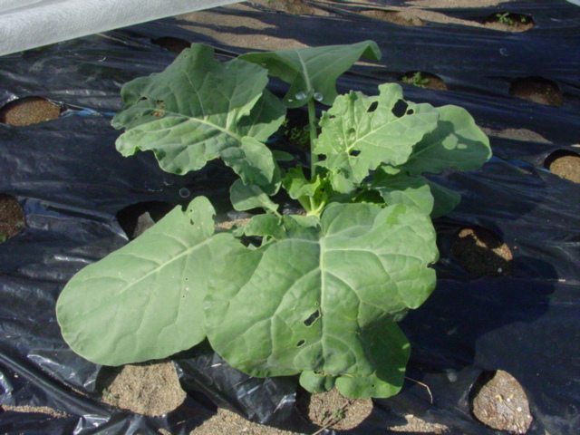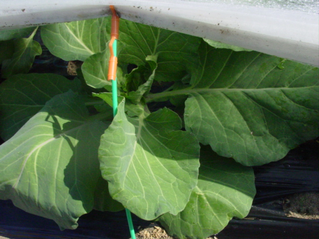 定植時点から不織布をかけていたブロッコリーにはまったく虫がついていません。砂地ですので、地中から虫が来ることがないのでしょう。飛来する虫さえ防げれば良いというのも砂地の利点なのでしょうか。それにしても、また一段と大きくなった気がします。このところの晴天と、一昨日に朝晩2回の水やりをしたおかげでしょうか?
