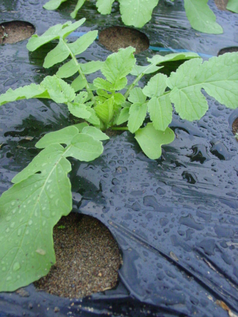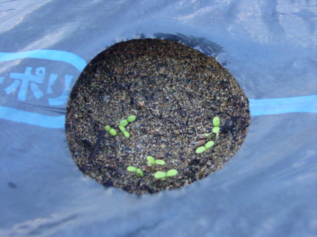 明日は週間予報通りに雨が降るようです。そんなわけで温泉から家に帰る途中、またS地区に寄って、春菊を播種しておきました。種の袋には「発芽率50%以上」とあります。他の種と比べると低めですし、一袋の容量も多いので、マルチ穴30箇所に対して1穴16粒も撒いてしまいました。全部発芽したらちょっと困りますが、そのときは間引くということで。