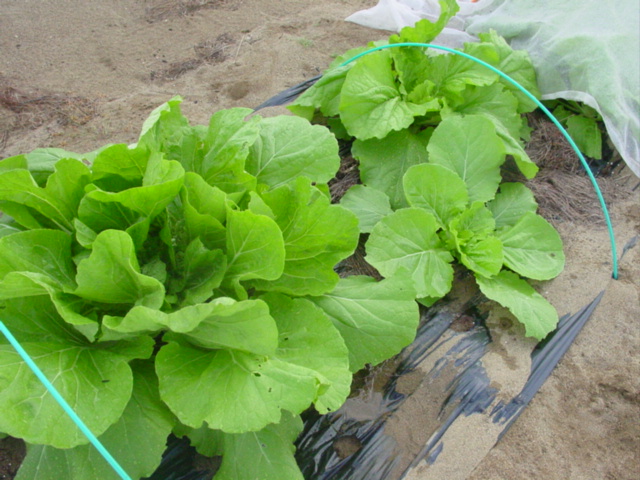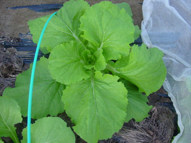 同時定植の白菜も元気です。Y地区の白菜に比べると、白っぽくてソフトな感じです。肥料が足りないのでしょうか。