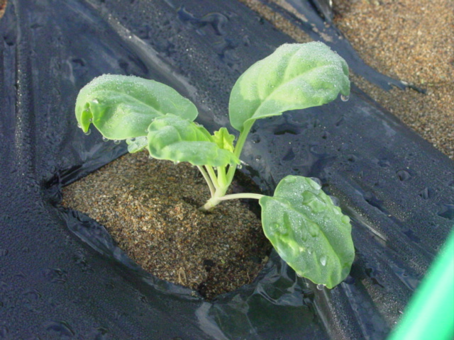 今日は午前中に交通規制があったので、昼過ぎから畑に向かいました。朝から晴れて、風もあったのですが、昨晩降った雨で畑はシットリ。キャベツを見ると、ひとまわり大きくなってるような気がします。一昨日夕方見た時は本葉8枚だったのに、今は10枚です。雨の効果か、それとも風で水分吸収が増えたのでしょうか。人が多少コントロールしたところで、自然の力には敵わないということですね。ともあれ、やっとキャベツらしくなってきました。