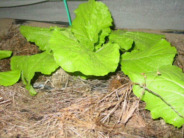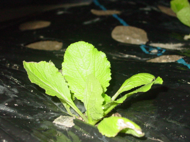 写真は昨日撮影したものです。この時期18時には日が落ちて、真っ暗なためフラッシュ撮影です。このところ朝が辛くて夜の水やりばかりです。野菜の根は夜に呼吸をするので、水やりは朝の方が良いと聞きました。日中は葉の呼吸によって水が失われるため、根からの吸収が増えます。また、地温が上昇すれば微生物の活動が活発になるため、微生物にも水を与え、有機肥料を野菜が吸収できる大きさまで分解してもらう必要があります。更に地温が高ければ栄養が水に溶出する量も増えますので、日中に水分が充分あるということは野菜の成長に効果絶大なわけです。とは言うものの、人間様の都合もありますので、やらないよりはと、毎晩畑に通うわけで・・・。排水性だけがとりえの砂地ですから、根が酸欠することもないでしょう。このところの成長を見る限り、間違ってはいないと思うのです。