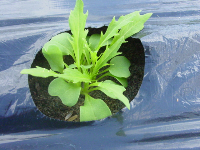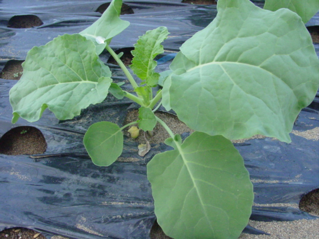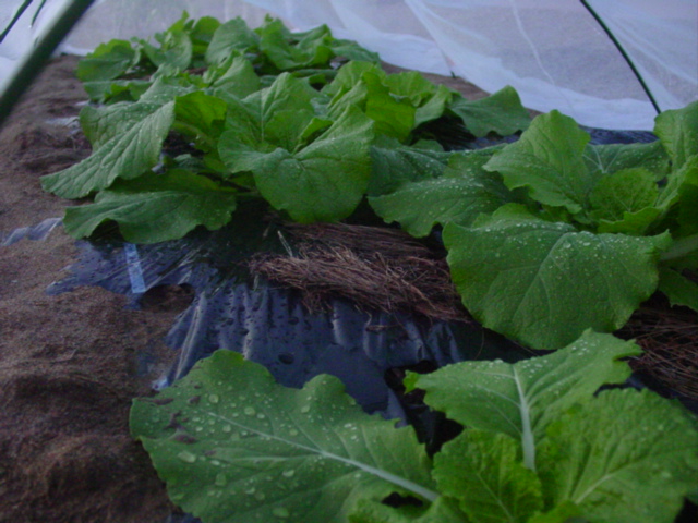 追肥のため寒冷紗のトンネルを片面ずつ外しました。トンネルに遮られて葉がクシャクシャになってますが、見事な成長ぶりです。定植後4週経過の株は、隣の株とトンネルに押さえられてるせいもありますが、葉が立っています。