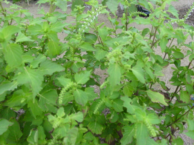 青じそです。かじられていない葉を捜すのが難しいくらいバッタにやられています。花芽が出てきましたので、今年は終わりですね。今日はこの花芽とナスの天ぷらで晩酌しました。花芽は葉よりも味がマイルドながら、香りが強く、歯ごたえがあります。