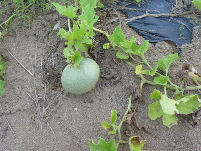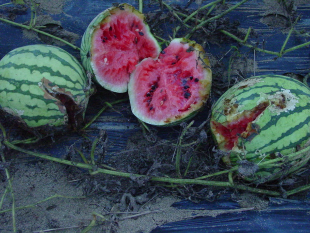 悲しい出来事がありました。出張と多忙のため週明けは畑を見ることができなかったのですが、雨が激しく降ったためか、スイカの実が割れてしまいました。蔓は枯れ上がり、割れなかった実にも虫がついて皮に穴が・・・。メロンと一緒に先に植えた苗も実がついたころから急激に弱弱しくなりました。去年植えた雑草だらけの場所と比べて土地が痩せているせいでしょうかねぇ。来年は畝高さや元肥など色々調整が必要です。