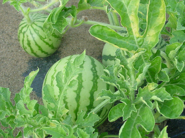 スイカ(縞紅西瓜:トーホク交配種)が先週、5株で10個ほど着果しました。