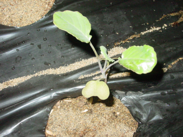続いて圃場全体に水やりしました。砂が湿ったところで定植後2週間のブロッコリーに土寄せです。苗の時から曲がってしまってますが、葉が大きくなってきましたのでいよいよ曲がりがきつくなってきました。双葉の付け根あたりまでを軽く起こしてやって周りのマルチ穴から手を入れてグイグイと砂を寄せてやります。周囲を高くしてやらないことには、植えているマルチ穴だけ砂を盛ったところで、すぐに崩れてしまいそうです。まさに土寄せ。双葉から上も曲がっている部分はあり、下を起こすと横を向いてしまうのですが、日の光を受けて、自然と上を向いてくれるのではないでしょうか。土寄せしながら、活着していなさそうな2株を間引き、病的に白く変色した葉を摘み取ってやりました。