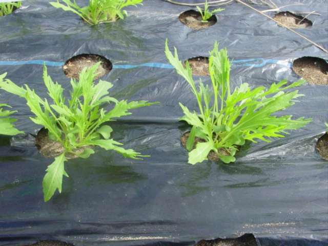 定植時点から不織布をかけていたブロッコリーにはまったく虫がついていません。砂地ですので、地中から虫が来ることがないのでしょう。飛来する虫さえ防げれば良いというのも砂地の利点なのでしょうか。それにしても、また一段と大きくなった気がします。このところの晴天と、一昨日に朝晩2回の水やりをしたおかげでしょうか?