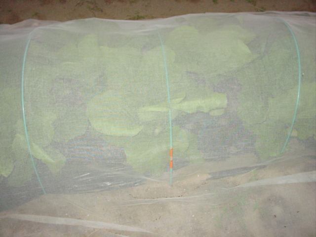 先攻隊でさえもまだ結球が始まっていません。ところで、こうして見ると結構虫に食われています。かけてある寒冷紗が5mなので、目いっぱい植えると、端の株が見えてしまい、虫の餌食になってしまっているようです。中間部分のつなぎとして、不織布を3mほど切って留めておきました。