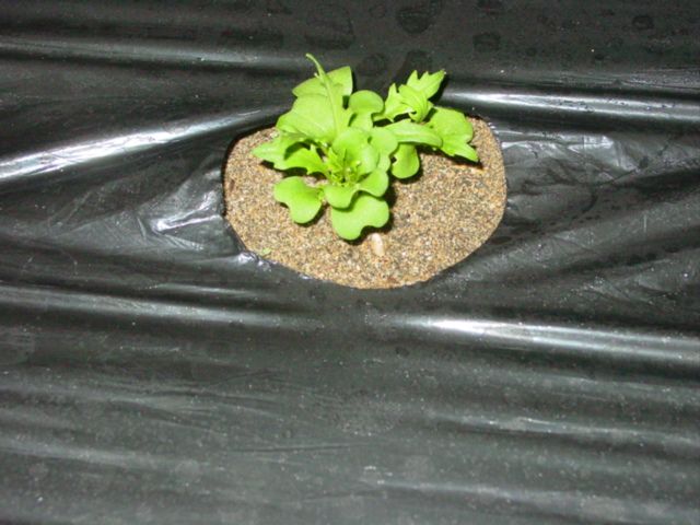 追肥のため寒冷紗のトンネルを片面ずつ外しました。トンネルに遮られて葉がクシャクシャになってますが、見事な成長ぶりです。定植後4週経過の株は、隣の株とトンネルに押さえられてるせいもありますが、葉が立っています。