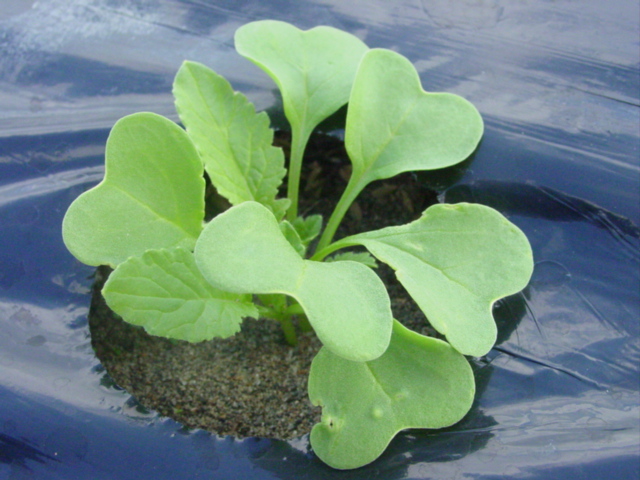 水菜です。独特の形をした本葉が伸びてきて、遠目にも水菜と分かります。