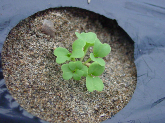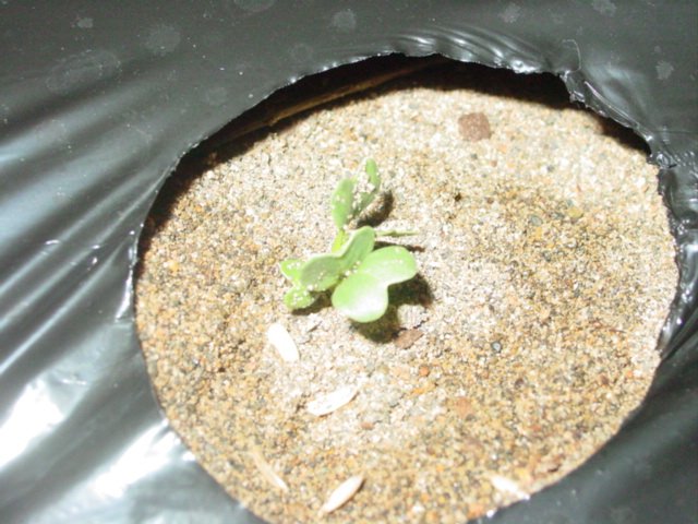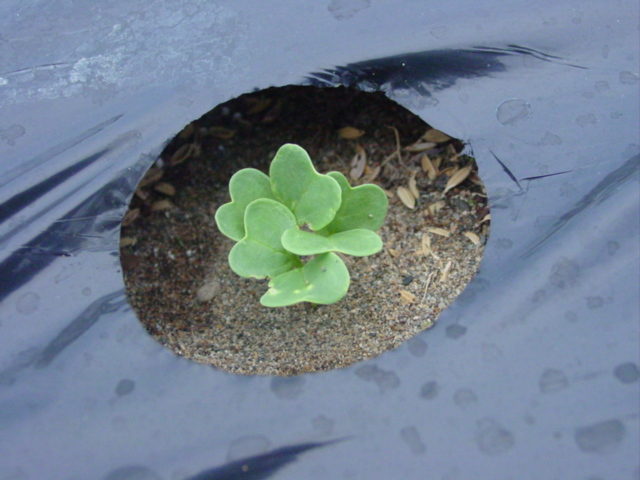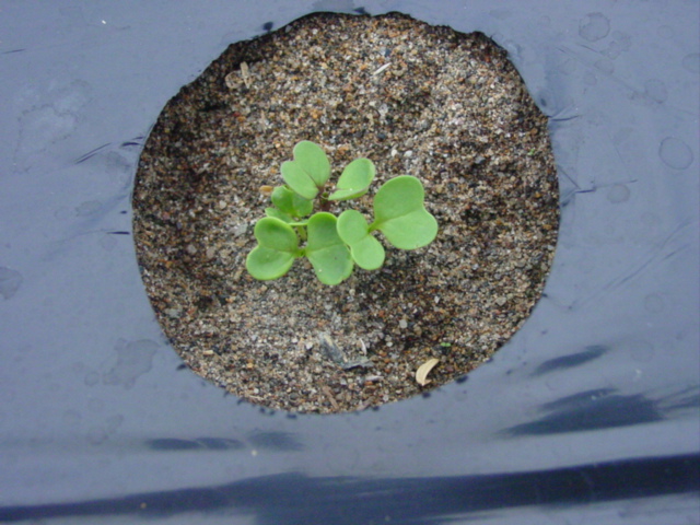 続いて圃場全体に水やりしました。砂が湿ったところで定植後2週間のブロッコリーに土寄せです。苗の時から曲がってしまってますが、葉が大きくなってきましたのでいよいよ曲がりがきつくなってきました。双葉の付け根あたりまでを軽く起こしてやって周りのマルチ穴から手を入れてグイグイと砂を寄せてやります。周囲を高くしてやらないことには、植えているマルチ穴だけ砂を盛ったところで、すぐに崩れてしまいそうです。まさに土寄せ。双葉から上も曲がっている部分はあり、下を起こすと横を向いてしまうのですが、日の光を受けて、自然と上を向いてくれるのではないでしょうか。土寄せしながら、活着していなさそうな2株を間引き、病的に白く変色した葉を摘み取ってやりました。