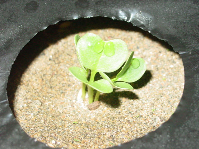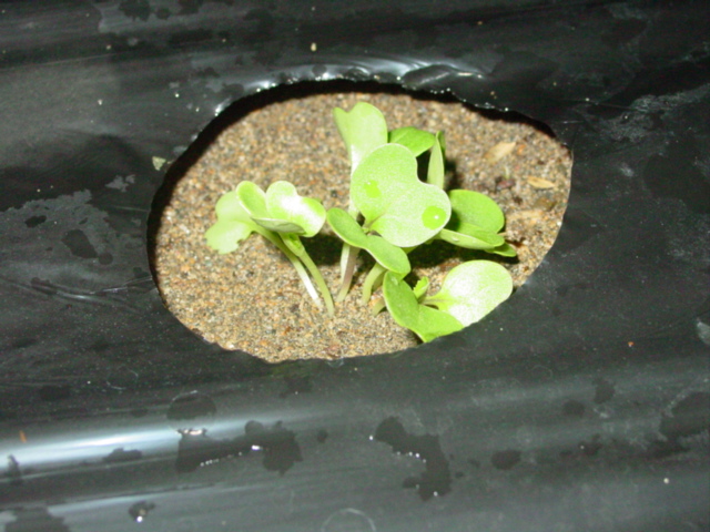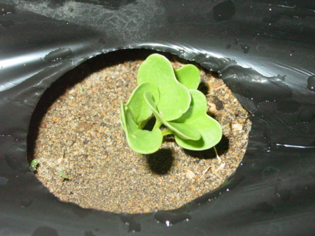 マルチ穴30箇所分に2,3粒ずつ撒いて、水菜の時と同様、雑草マルチを被せておきました。4日おきに撒いていくつもりなので、発芽と播種が同時ぐらいでしょうか。