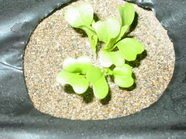 大根の双葉が広がりました。水菜、小松菜と比べ、形は同じでも、ひとまわり大きいです。