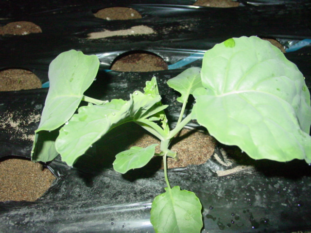 ブロッコリーです。定植後2週間という期間のせいか、それとも土寄せのせいか分かりませんが、グングン成長しています。葉の形も長円形になって、ブロッコリーらしく、たくましくなってきました。こうなると安心して見ていられます。