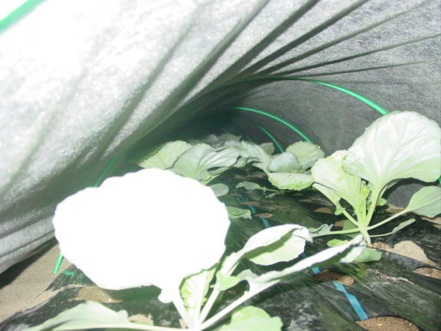 食事現場を押さえたのは初めてなのですが、せっかく育てた野菜を悠然と食べているその姿を見ると急に憎らしくなってきますね。捕殺してやりました。この後、不織布の中のキャベツにも1匹発見し、捕殺しました。どこから入ったんでしょうね?とにかく、気温の下がった今でも、無農薬露天栽培は無謀と悟り、不織布を買いに走りました。ちょうど値下げ中ということもあり、奮発して50m長を購入。有用資材は常備しとくに限ります。