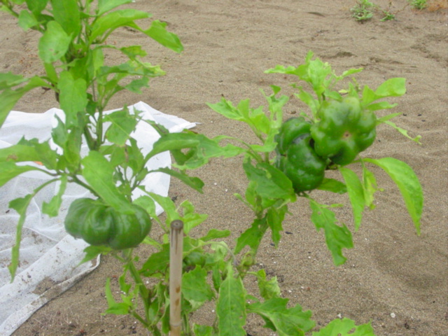 お隣に植えているカラーピーマンです。緑→黒→赤と変化するので、熟してみないと分かりませんが、なんとなく色が悪いような・・・。