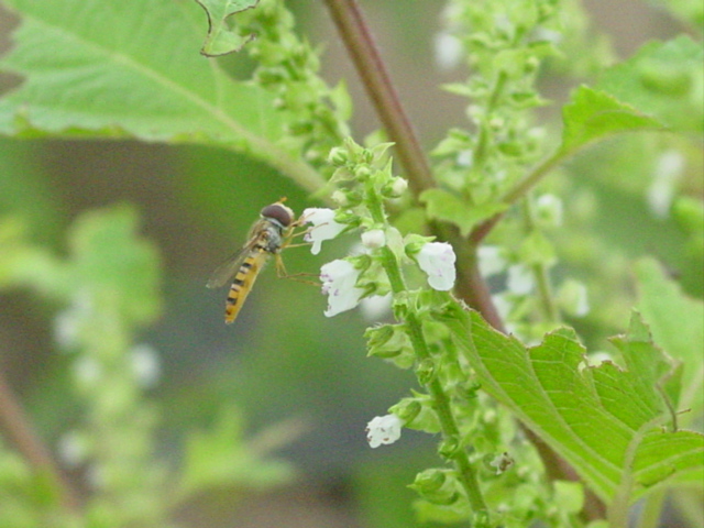 ハナアブの仲間でしょうか。シソの花が美味しいのでしょうかね?